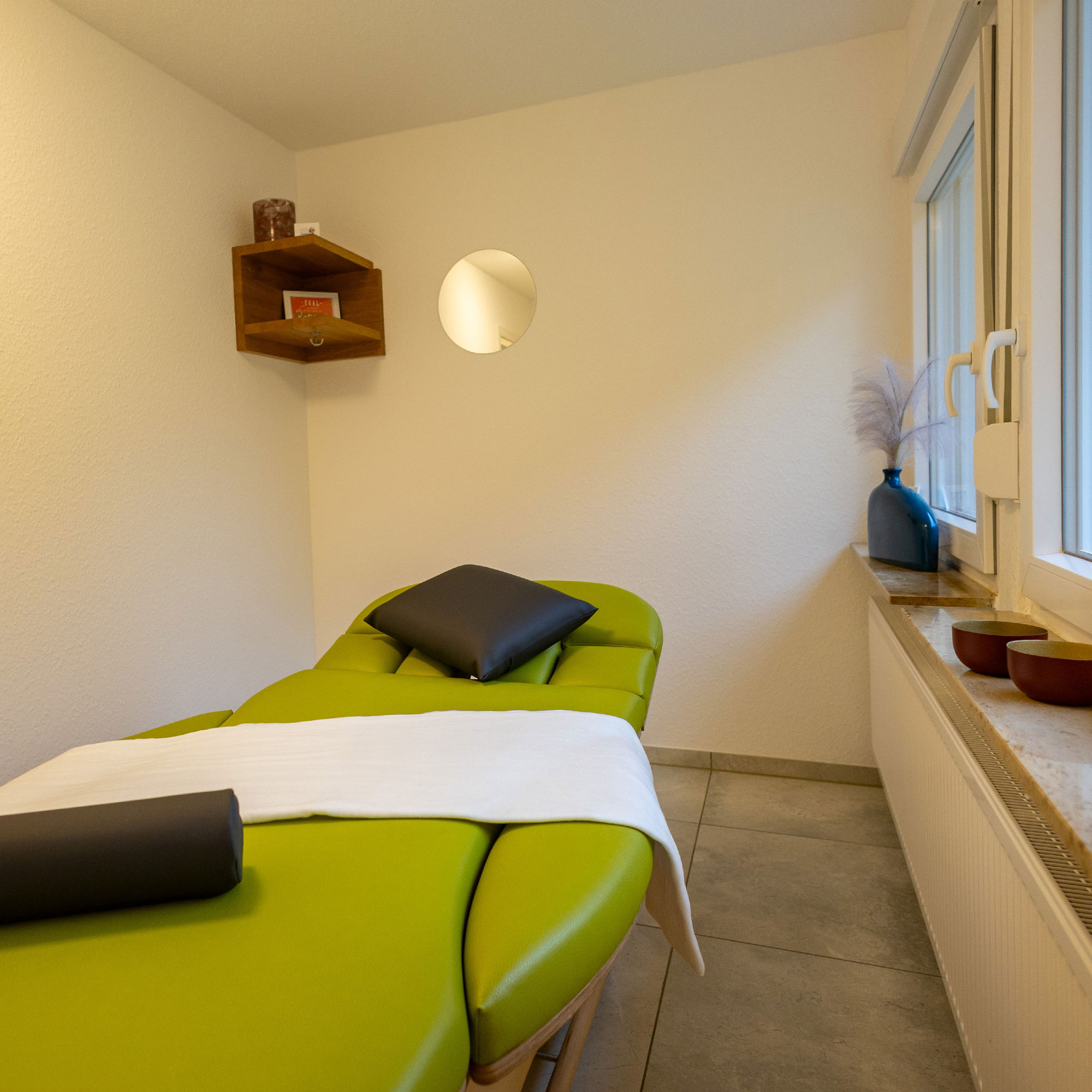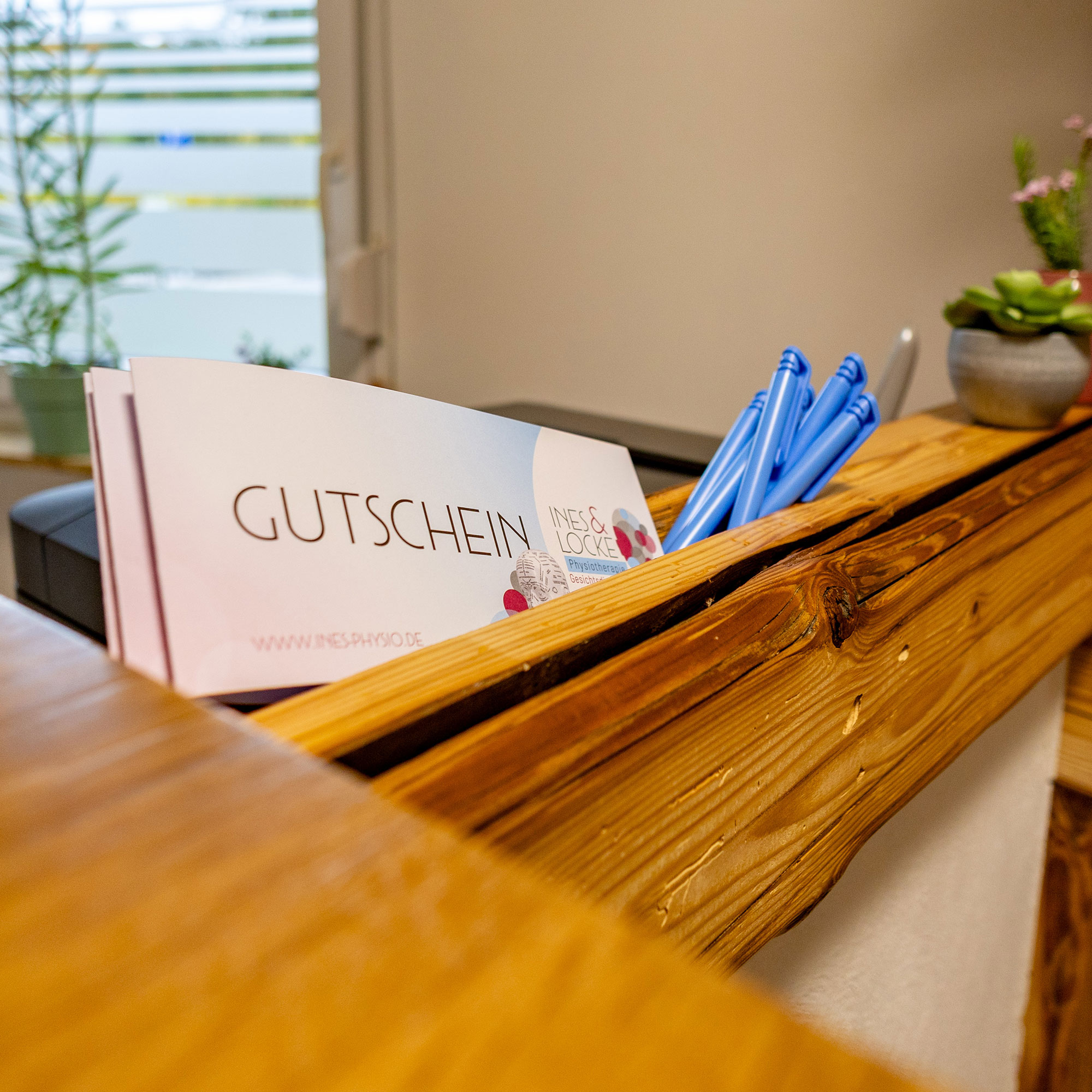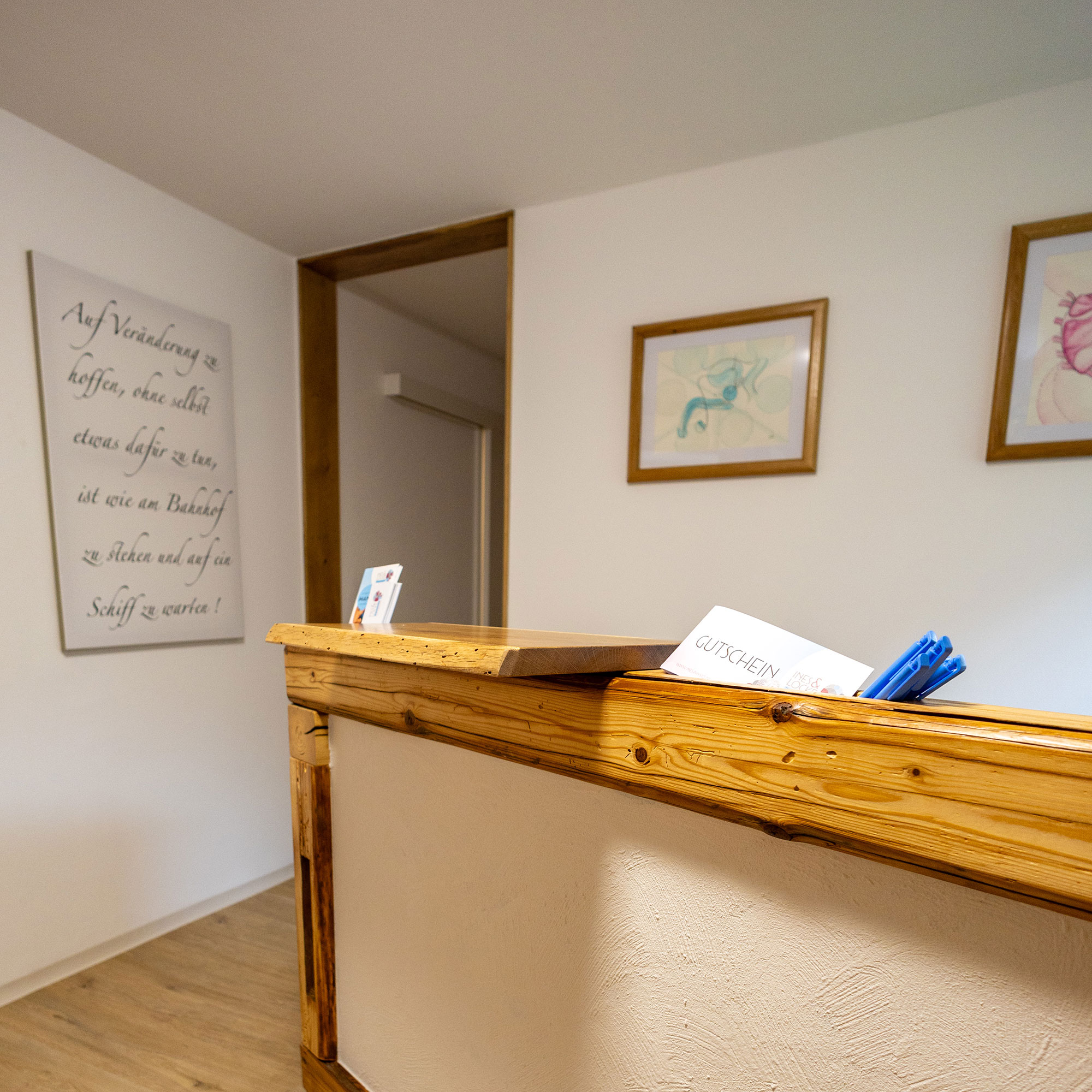 In meiner Praxis begrüße ich Sie an unserer Empfangstheke. Dort klären wir die obligatorischen Details und wechseln dann in Kabine 1, Kabine 2 oder in den Gymnastikraum.